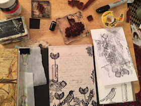Next, I stamped on the envelope around the edges and bottom so that the vintage handwritten ledger page would show through. I decided to also add some of my favorite stamps from other sets. I used a bird from EGL-19  and a chrysanthemum and leaf from EGL-27.